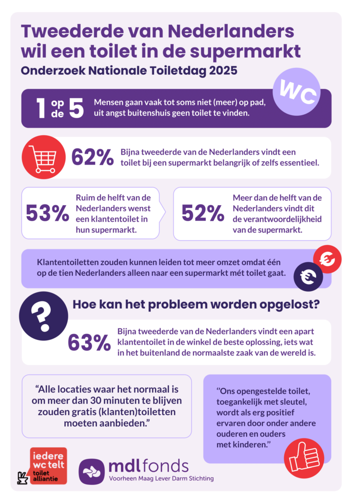 63 procent van de Nederlanders wil de mogelijkheid hebben om in de supermarkt naar het toilet te kunnen. Voor één op de vijf Nederlanders is een toilet in de supermarkt zelfs belangrijk of essentieel. Dit blijkt uit een representatief onderzoek dat MDL Fonds heeft laten uitvoeren onder meer dan 1000 Nederlanders, in het kader van Nationale Toiletdag op donderdag 20 maart.